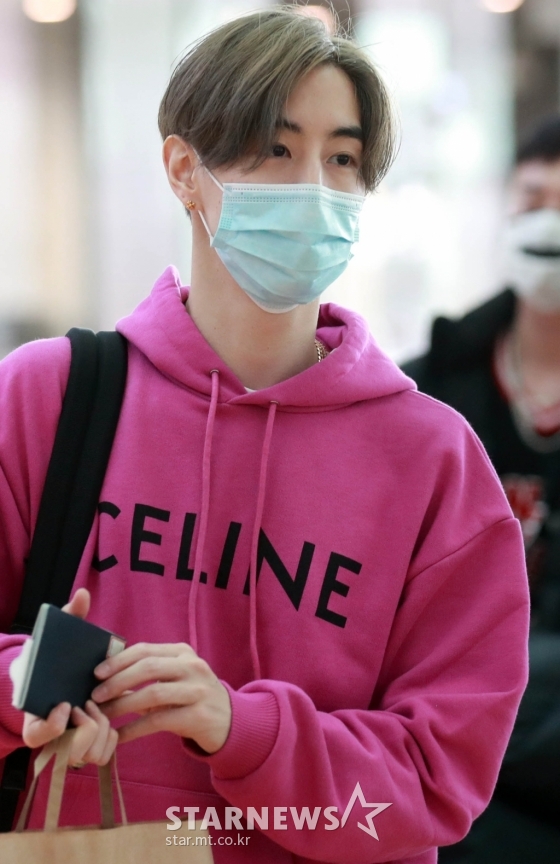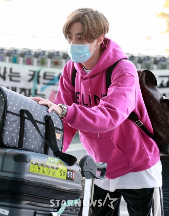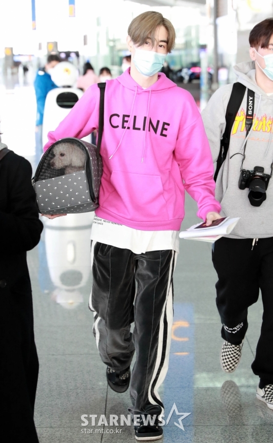 이날 취재진의 카메라에 포착된 마크는 트레이닝 바지에 핫핑크 후드티 차림으로 등장해 출국 수속 절차를 밟았다. 마크의 반려견 마일로도 그의 출국길을 동행해 눈길을 끌었다.
