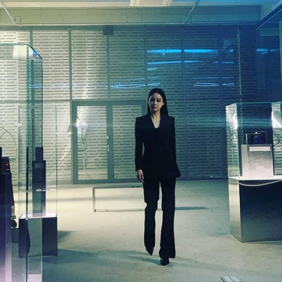 공개된 사진 속에는 김태희가 광고 촬영 중인 모습이 담겨 있었다. 그는 올블랙 수트를 차려입고 카리스마 있는 자태를 선보였다.