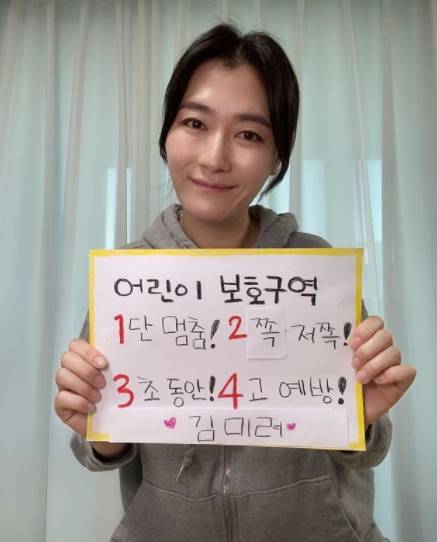 공개된 사진 속 김미려는 '어린이 보호구역 1단 멈춤! 2단 저쪽! 3초 동안! 4고 예방!'이라는 캠페인 문구를 써서 들고 있었다. 이는 행정안전부에서 올해 새로 선포한 어린이 교통 안전 슬로건이다.