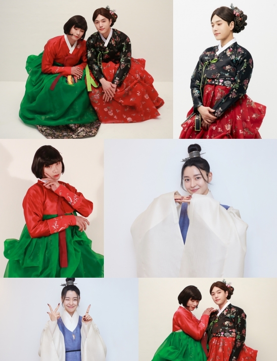 공개된 사진 속에는 한복을 풀 장착한 채 여장과 남장으로 파격 변신한 김명수, 권나라, 이이경의 모습이 담겼다.
