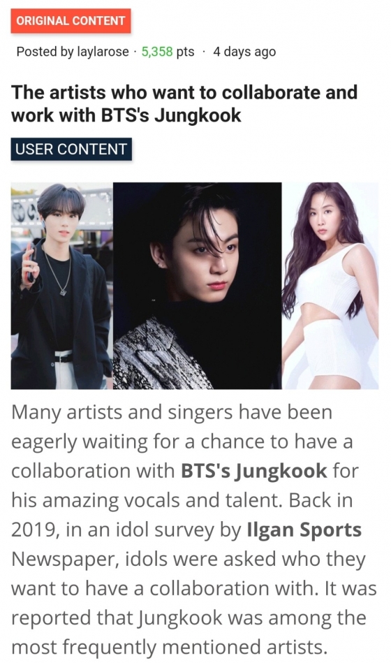 미국 매체 올케이팝은 최근 '방탄소년단 정국과 협업, 작업하고 싶은 아티스트들'이라는 제목의 기사에서 "많은 아티스트와 가수들이 놀라운 보컬과 재능을 지닌 방탄소년단 정국과 컬래버레이션을 할 기회를 간절히 기다려왔다"며 17명의 아티스트 및 가수들을 나열해 소개했다.