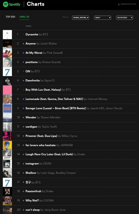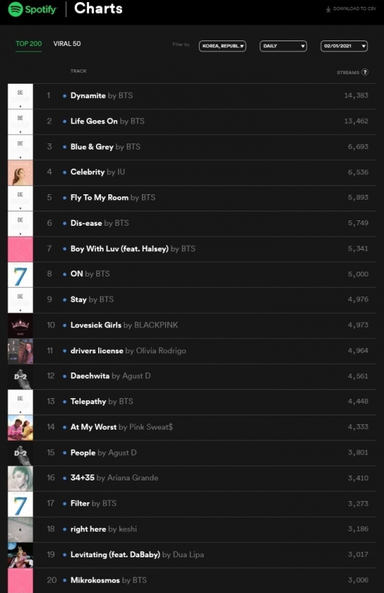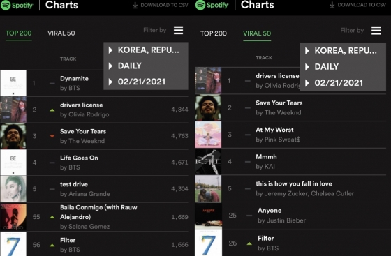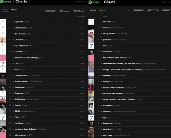 스포티파이가 한국에 도입된 첫날 스포티파이 한국 '톱200'(Top 200, 2월 1일) 차트에서 1년 전 발매 된 MAP OF THE SOUL : 7 앨범 수록곡인 지민의 '필터'는 전체 17위에 올랐다.