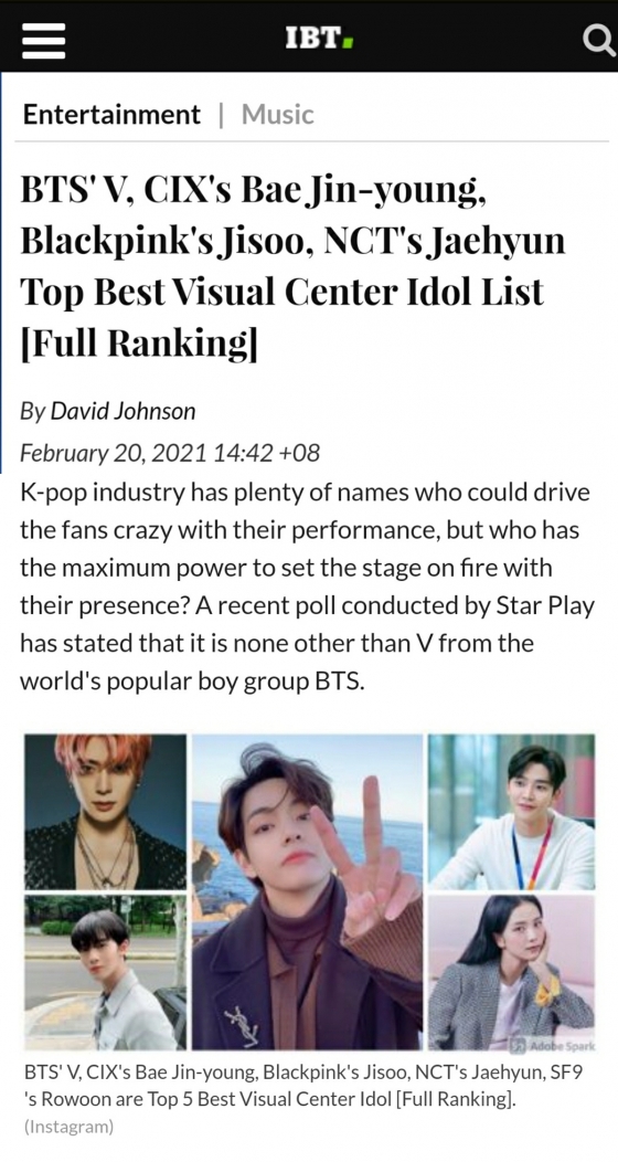 미 경제지 인터내셔널 비즈니스타임즈(IBT)와 케이팝스타즈는 "무대를 지배하는 최고의 비주얼 센터 아이돌을 뽑는 투표에서 뷔가 1위를 차지했다"며 뷔의 올라운더 재능에도 주목했다.