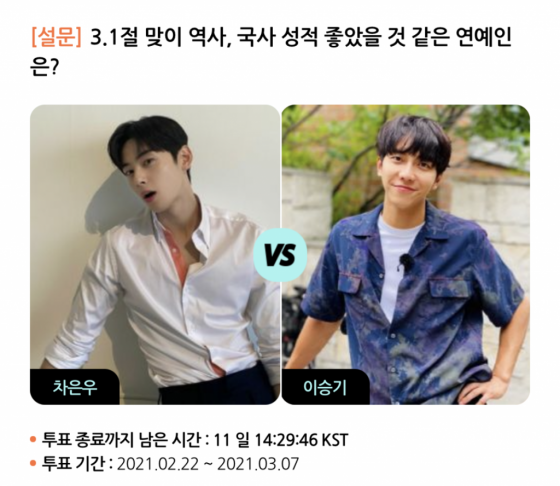 '3.1절 맞이 역사, 국사 성적 좋았을 것 같은 연예인은?' 이라는 이색 설문이 진행중이다.