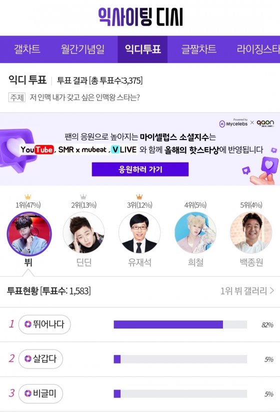 뷔는 커뮤니티 포털사이트 디시인사이드와 취향 검색 기업 마이셀럽스에서 운영 중인 '익사이팅 디시'에서 지난 2월 21일부터 27일까지 '저 인맥 내가 갖고 싶은 인맥왕 스타는?' 투표에서 총 3375표 중 1583표를 획득해 1위에 올랐다.