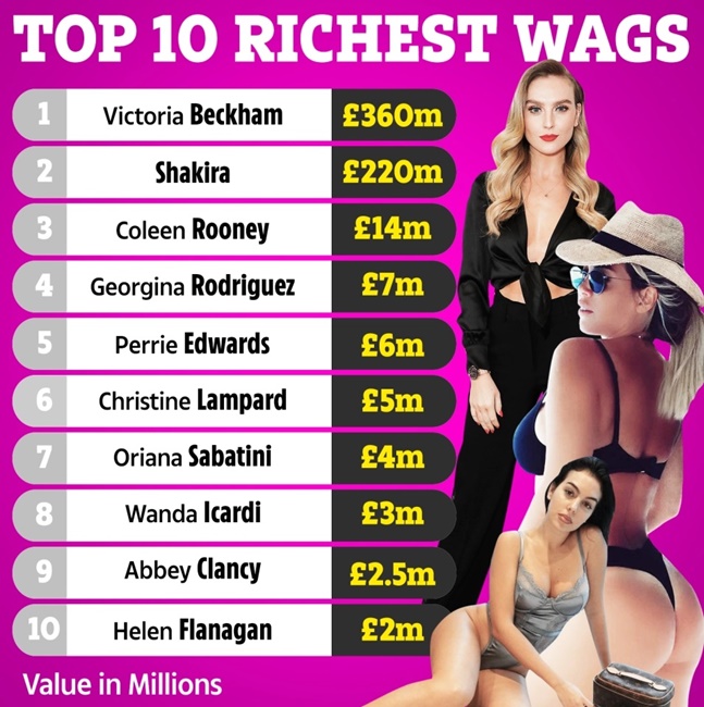 축구 전문가로 활약중인 피터 크라우치의 부인 애비 클랜시가 250만 파운드(약 39억원)로 9위에 이름을 올렸고, 10위는 스콧 싱클레어(프레스턴)의 여자친구 헬렌 플래너건이다. 재산은 200만 파운드(약 31억원)다.