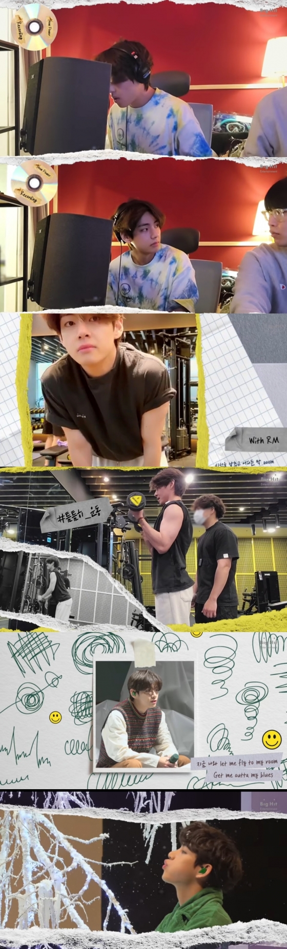 1분 30초가량의 V로그에는 뷔가 자작곡 '스노우 플라워'(Snow Flower) 곡 작업과 녹음을 하는 모습. 틈틈이 운동하는 모습, 스케줄 중에 잠시 한가한 시간에 여유를 즐기는 모습이 담겼다.