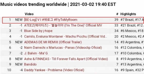 영상이 공개된 후 전 세계 인기 유튜브 동영상 1위, 37개국에서 트렌딩되며 큰 인기를 끌고 있으며 KIM TAEHYUNG, #BE_Log, #filmed by_V, #ProudOfYouTaehyung, #My_World, #VLog 등이 전 세계 실시간 트렌드딩됐으며 일본 트위플 4위 등을 장식했다.