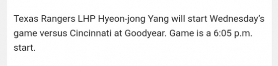 텍사스 구단은 23일(한국시간) "양현종이 오는 25일 오전 10시 5분 미국 애리조나 굿이어 볼파크에서 열리는 신시내티와 경기에 선발 등판할 예정"이라고 발표했다.