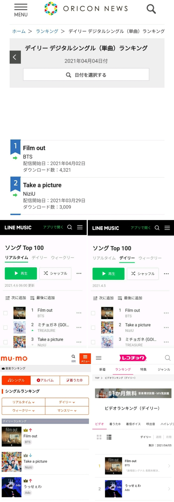 일본 오리콘이 발표한 최신 차트에 따르면(2021년 4월 4일 자) 지난 2일 발매된 방탄소년단 일본 베스트앨범 선 공개곡 '필름 아웃'은 다운로드 수 4321건을 기록하며 데일리 디지털 싱글 랭킹에서 1위에 올라 3일 연속 정상의 자리를 지켰다.