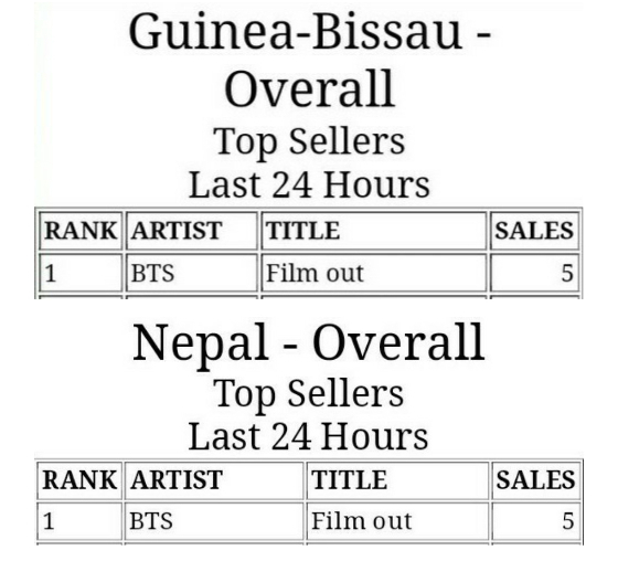 5일에는 네팔 아이튠즈 톱송 차트 1위에 올랐고 '필름 아웃'은 발매 이후 아이튠즈의 100개 국가에서 1위에 랭크되며 글로벌 음원 파워를 보여줬다.