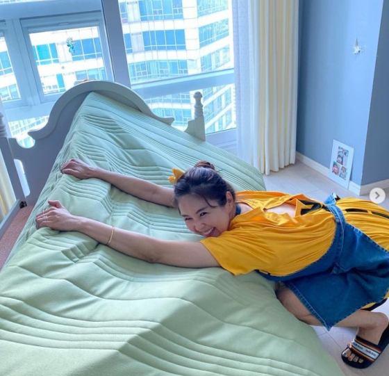 공개된 사진 속 장영란은 침대 매트리스에 커버를 씌우고 틀을 만드는 등 힘든 일을 하고 있다.