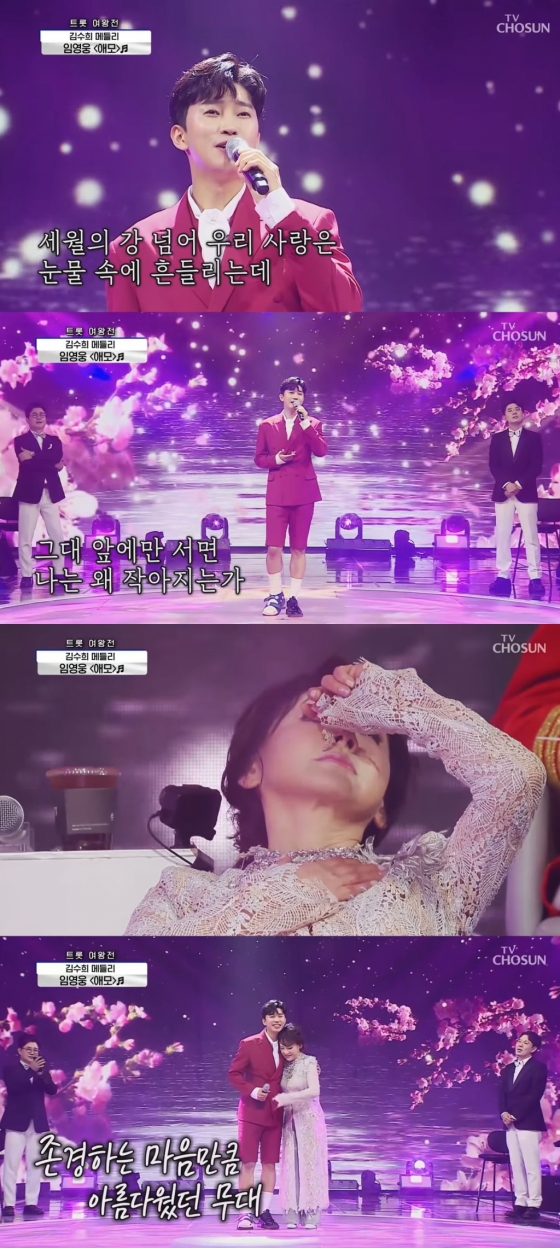 더한 감동도 있었다. 임영웅은 1대 1 노래방 점수 대결에서 김수희의 대표곡 '애모'를 특유의 애잔한 감성으로 선보여 원 가창자 김수희의 눈물을 흘리게 만들었다. 김수희는 이날 임영웅 무대 후 직접 무대로 나와 임영웅과 포옹으로 감동과 감사를 나타냈다.