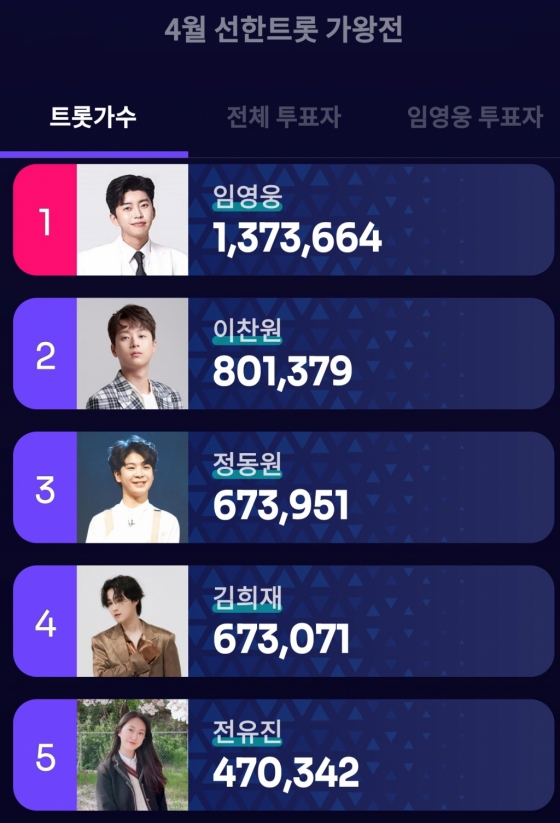 1위 임영웅에 이어 이찬원이 80만 1379표로 2위, 정동원이 67만 3951표로 3위, 김희재가 67만 3071표로 4위, 전유진이 47만 342표로 5위에 올랐다.