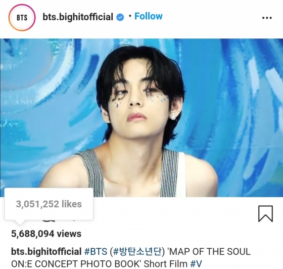'인스타그램 최강자' 뷔의 질주는 이전부터 이어져 왔다. 뷔는 지난해 한국 남자 연예인 최초로 인스타그램 600만 '좋아요'를 돌파하며 놀라움을 안겼다.