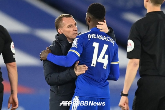 켈레치 이헤아나초를 안아주고 있는 브랜든 로저스(왼쪽) 레스터 감독. /AFPBBNews=뉴스1