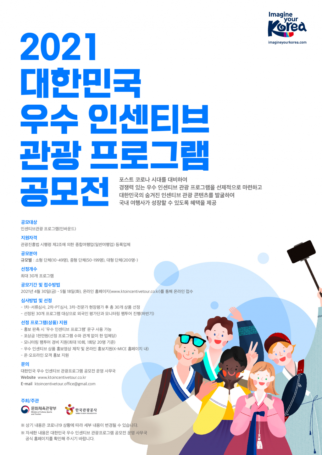 문화체육관광부(장관 황희)와 한국관광공사(사장 안영배)는 방한관광객 급감으로 사실상 영업 중단 상태인 여행업, 마이스(MICE) 등 관련업계의 재생을 지원하기 위한 '대한민국 우수 인센티브관광(포상관광) 프로그램' 및 '지역 매력발산 국제이벤트' 공모를 실시한다.