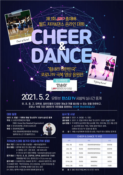 유, 초중고, 대학생, 일반인들이 다양한 재능과 끼를 발산할 수 있는 장을 마련하고 코로나 19로 지친 대한민국 국민들을 응원하는 비대면 영상 대회를 개최한 SBO 정천식 총재는 "참가자들의 창의적 경연 실력을 보면서 대한민국의 치어와 댄스는 앞으로 K-POP과 함께 새로운 K-스포테인먼트로 세계적 주목을 받게 될 것이라는 확신을 갖게 됐다"고 밝혔다.
