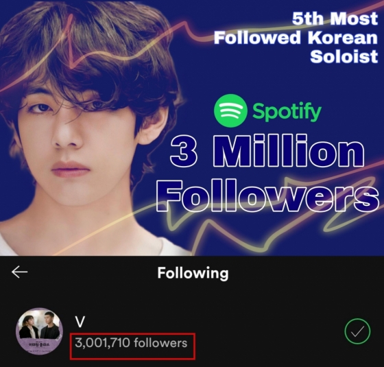 지난 3일 스포티파이에 따르면 뷔는 팔로워 300만명을 돌파했다. 이로써 뷔는 K팝 솔로 아티스트로서는 제이홉, RM, 슈가, 아이유를 이어 다섯 번째로 많은 팔로워를 가지게 됐다.