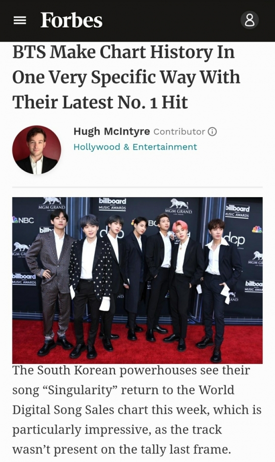 미국 경제전문지 포브스(Forbes)는 해당 기록을 집중조명하며 '싱귤래리티'가 최근에 발표된 곡이 아닌데도 불구하고 빌보드 월드 디지털 송 세일즈 차트에서 1위를 한 것은 매우 인상적이며 극히 드문 경우라고 강조했다.