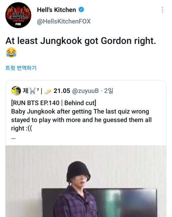 '헬스키친' 공식 트위터는 지난 6일 공개된 방탄소년단 자체 예능 프로그램 '달려라 방탄' 140화 비하인드 영상 일부를 인용해 "적어도 정국이가 고든은 바로 잘 알아봤어"라는 글을 게재했다.