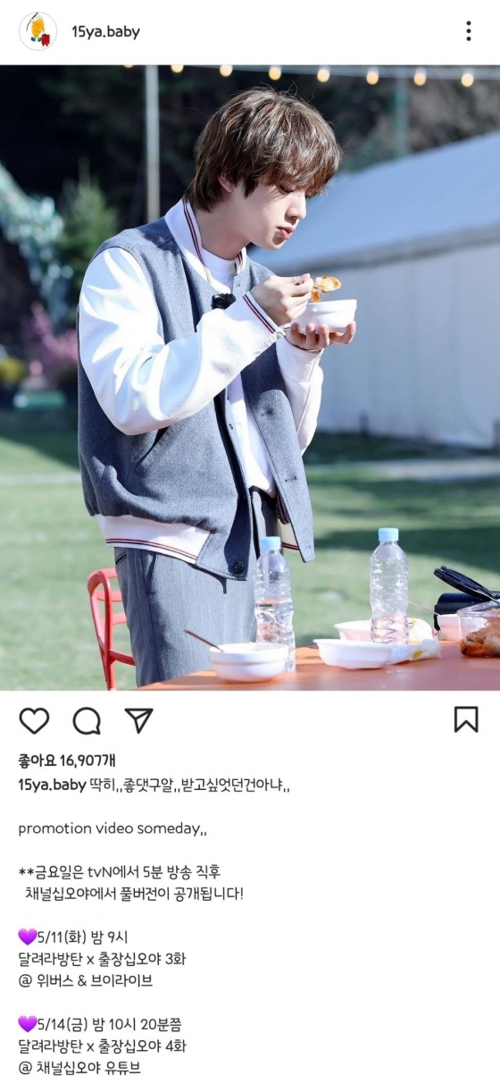 '출장 십오야'는 지난 9일 공식 인스타그램을 통해 '딱히,,좋댓구알,,받고싶었던건아냐,,'라는 글과 함께 진의 사진을 공개했다.