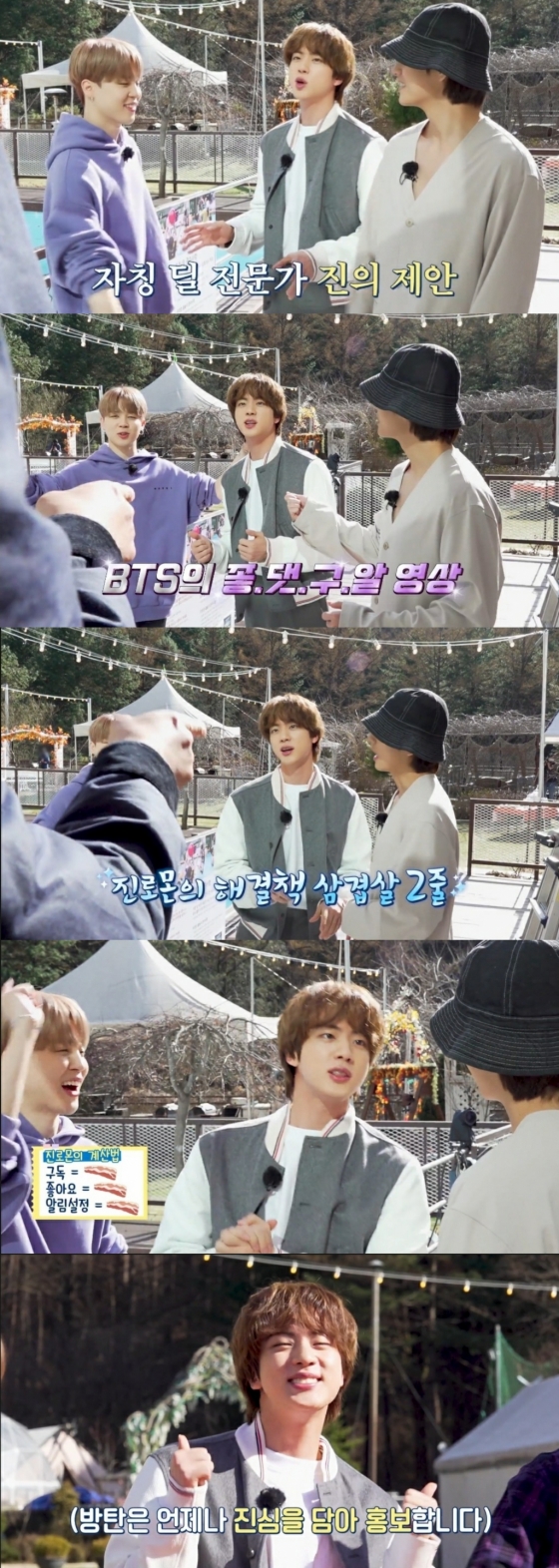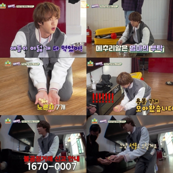 진은 방탄소년단에게 "게임에서 지면 홍보영상을 찍어줄 수 있냐"는 나PD의 말에 조금의 망설임도 없이 귀여운 표정을 지으며 "구독, 좋아요, 알림설정!"을 사랑스럽게 외쳐 팬들의 환호성을 이끌었다.