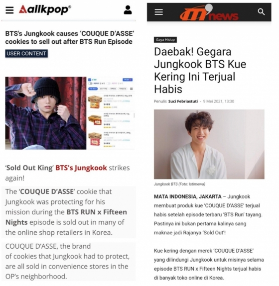북미 한류 매체 'allkpop'(올케이팝)은 '방탄소년단 정국 때문에 달려라 방탄 방송 이후 쿠크다스가 품절 사태를 빚다'라는 제목의 기사에서 '달려라 방탄' 방송 당시 정국이 미션을 위해 지키고 있던 쿠크다스가 국내 온라인 유통업체에서 상당수가 품절됐다고 전하며 다시 한 번 정국이 자신의 경제적 영향력과 브랜드 파워를 입증했다고 전했다. 인도네시아 매체 'minews'(민뉴스)도 '달려라 방탄' 방송 후 정국이 쿠크다스를 품절되게 만들었다고 정국의 파급력과 영향력을 전했다.
