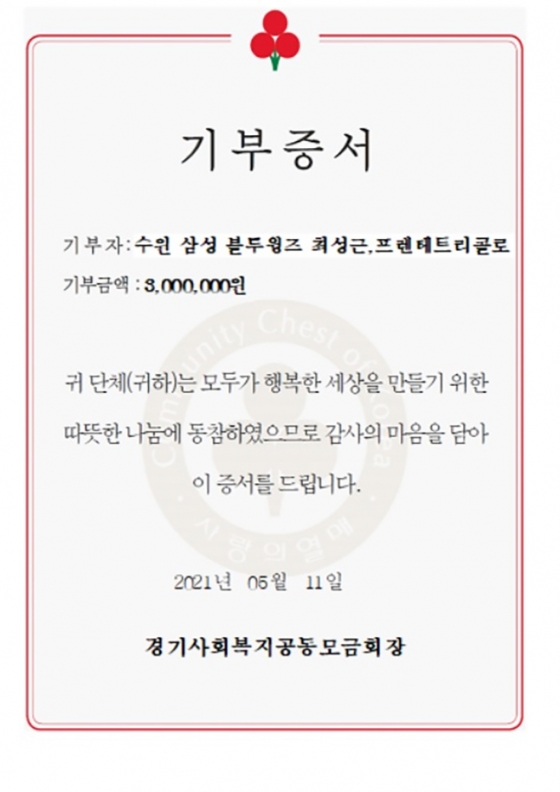 13일 수원 구단에 따르면 최성근과 수원 서포터스는 지난 11일 수원시에 300만원을 기부했다. 이 기금은 여름나기 캠페인으로 취약계층 냉방비 지원에 사용될 예정이다.