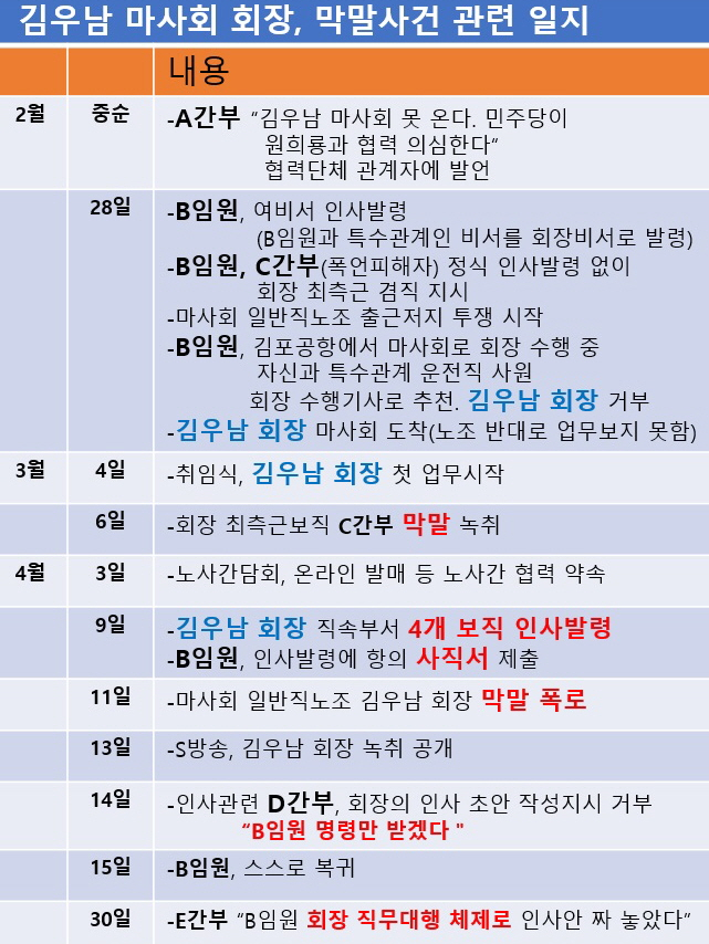 4일부터 일을 시작한 김우남 회장은 최측근이 된 C와 업무를 진행했다. 6일 김우남 회장은 치명상을 입었다. C와 별정직 채용에 관한 대화 중 의견 차이를 보였고 화가 난 김우남 회장은 해선 안 될 막말을 했다. 최측근인 C는 이때 회장과의 대화를 몰래 녹취했다.