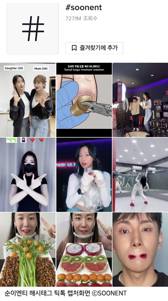 틱톡 공식 MCN이며 유튜브와 인스타그램 등 다양한 온라인 미디어 창작자, 온라인 콘텐츠 메이커로 불리는 틱톡커와 인플루언서를 전속으로 매니지먼트하며 활발히 활동중인 순이엔티의 전속 인플루언서들은 영상 콘텐츠를 게시 할 때 멘션에 '#SOONENT'를 작성하고 있다.