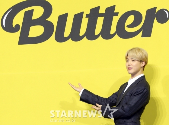 방지민이탄소년단(BTS) 21일 오후 서울 송파구 방이동 올림픽홀에서 진행된 새 싱글앨범 'Butter' 발매 기념 쇼케이스에서 포즈를 취하고 있다.
