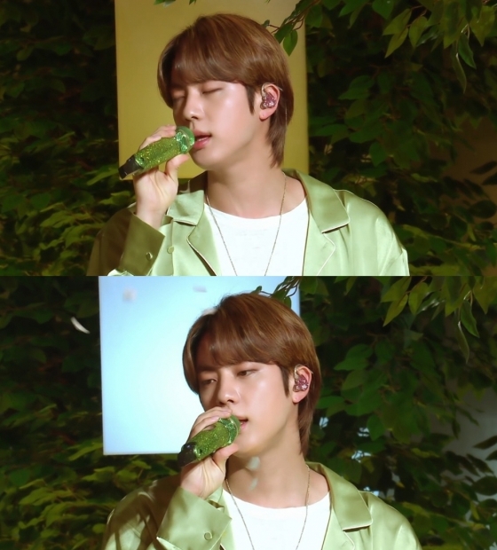 진은 자연스럽게 내린 갈색 머리에 실크 재질의 셔츠를 입고 등장하여 특유의 애절하면서도 서사 가득한 분위기로 팬들의 마음을 흔들었다.