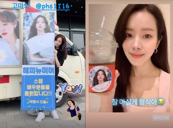 함께 공개된 사진 속에는 한지민이 커피차 앞에서 여러 포즈를 취하고 있다. 해당 커피차는 박형식이 선물한 것으로, "'해피뉴이어' 스태프, 배우 분들을 응원합니다"라는 문구가 적혀있다.
