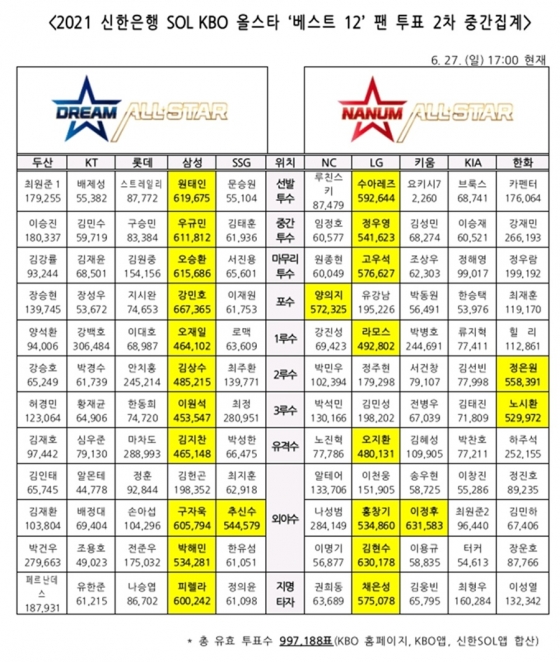 팬 투표 100%로 결정되는 이번 2021 신한은행 SOL KBO 올스타전은 KBO 리그 타이틀스폰서인 신한은행에서 운영하는 신한SOL(쏠)앱, KBO 홈페이지와 KBO 공식 앱에서 동시에 운영된다. 지난 27일 오후 5시 기준 2차 중간집계 결과 총 투표수는 99만7188표로 지난해 2차 집계 때 84만6758표보다 10만 표 이상 증가했다.