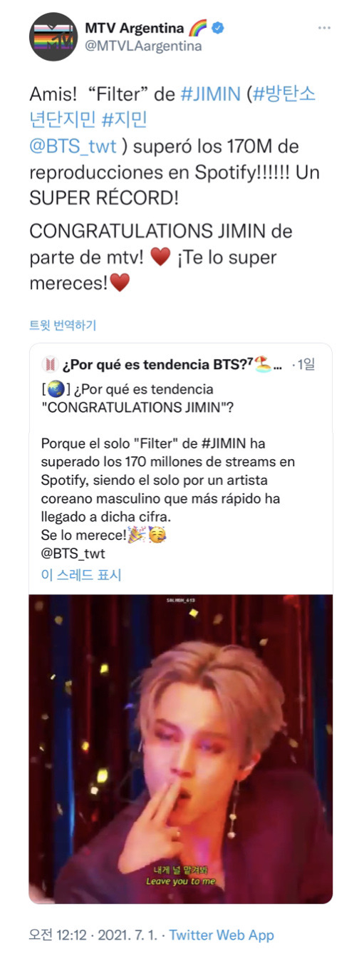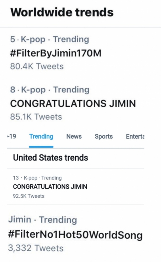 #FilterNo1Hot50WorldSong은 'Jimin' 카테고리 안에 트렌딩되며 '트위터의 제왕' 다운 면모를 보였고, '엠티비 아르헨티나'(Mtv Argentina) 공식 계정도 '필터'의 놀라운 기록에 축하 글을 게시했다.