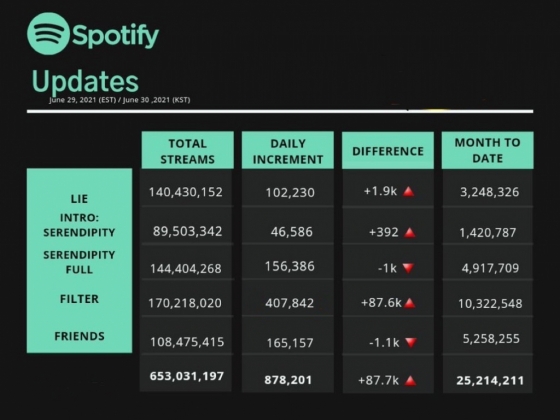 방탄소년단(BTS) 지민의 솔로곡 '필터'(Filter)가 스포티파이' 1억 7000만 스트리밍 돌파 대기록을 세우고 글로벌 K팝 투표 1위를 차지, 수많은 기록을 쏟아내며 겹경사를 맞이했다.
