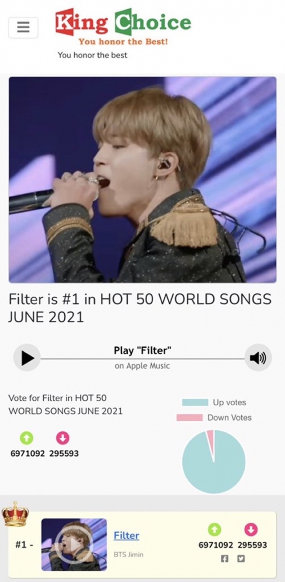 6월 17일에서 30일 까지 진행된 투표 결과 '2021년 6월 월드송 핫50'에서 지민의 '필터'(Filter)가 전체 697만 1092표로 1위에 올랐다.