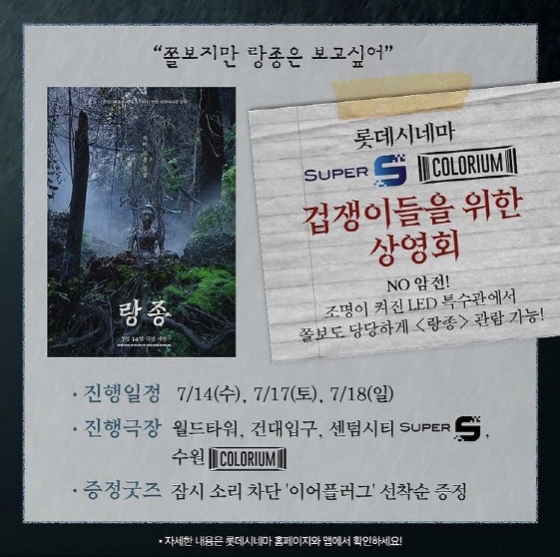 '랑종'은 신내림이 대물림되는 한 가족이 경험하는 미스터리한 현상을 담은 영화. '곡성' 나홍진 감독이 참여해 벌써부터 기대감이 높다. 이번 겁쟁이 상영회는 호러 영화를 잘 보지 못하는 관객을 위해 불이 켜진 상태에서 상영하는 이벤트다. 수퍼S와 컬러리움관은 일반 상영관 대비 10배 밝은 밝기의 LED 스크린을 갖춘 특별 상영관이라 불이 켜진 상태에서도 선명하게 관람할 수 있다는 설명이다.