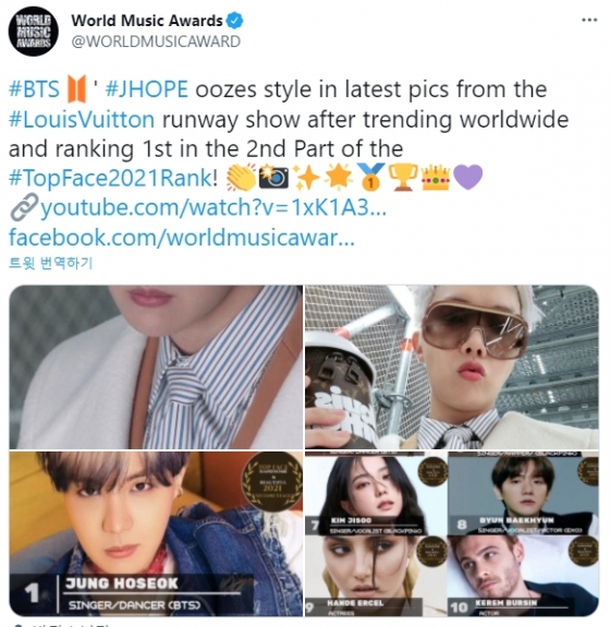 월드 뮤직 어워즈(World Music Awards)도 지난 8일 공식 트위터를 통해 "제이홉이 루이 비통 런웨이에서 스타일을 발산한 뒤 월드 와이트 트렌딩 괴고 톱 페이스 2021 2단계에서 1위에 올랐다"라고 전했다.