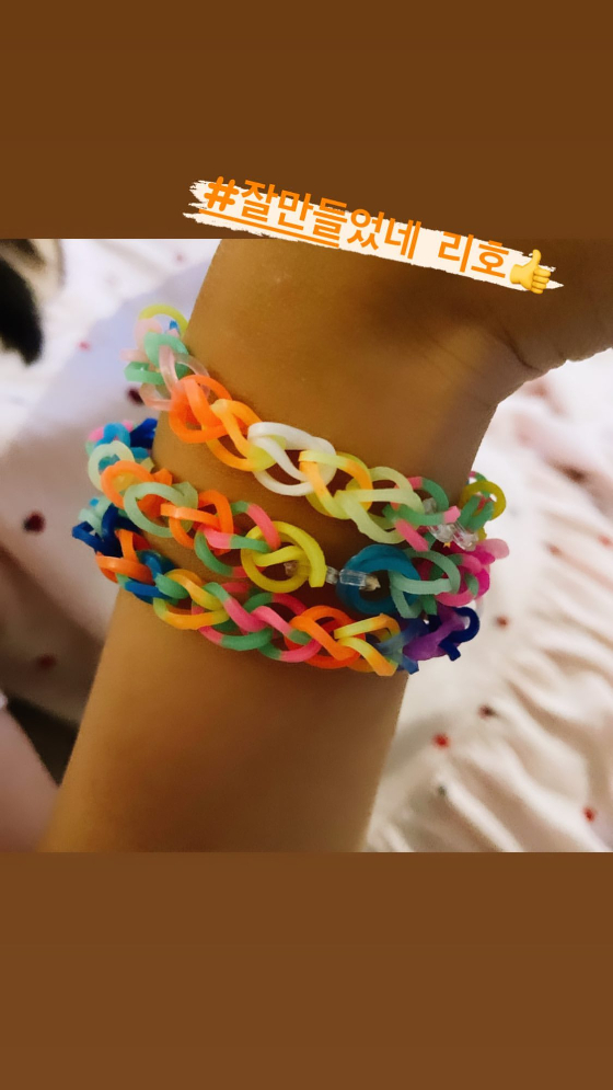 공개된 사진 속에는 손태영의 딸 리호가 만든 팔찌의 모습이다. 이는 머리 묶는 끈으로 엮어 만든 것이다. 손태영이 칭찬할 만한 수준의 솜씨다.