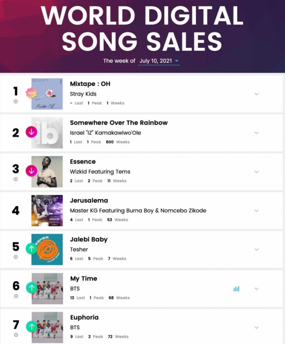 또 정국의 솔로곡 'Euphoria'(유포리아)는 월드 디지털 송 세일즈 차트 7위에 올랐다.