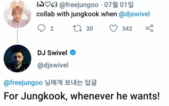 이에 'DJ Swivel'은 "For Jungkook, whenever he wants!"(정국을 위해서, 그가 원하면 언제든지요!) 라는 명쾌한 답변을 하면서 컬레버레이션에 대한 기대감을 드높였고 정국에 대한 각별한 애정도 엿보게 했다.