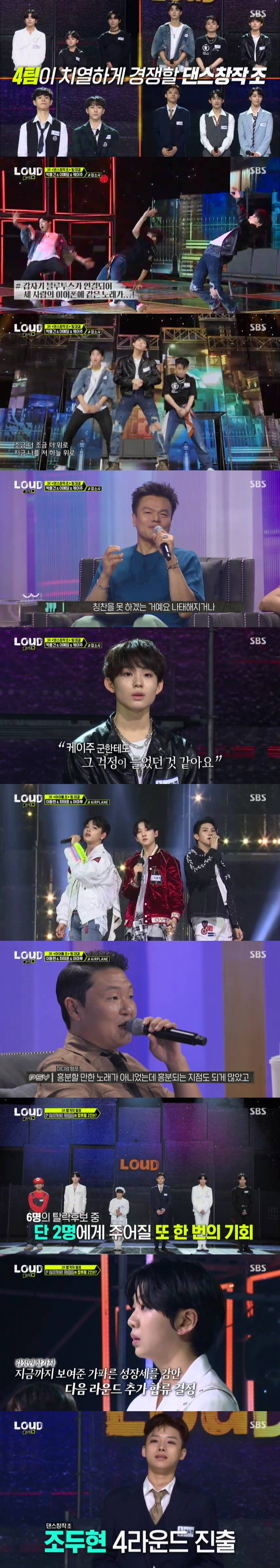지난 10일 방송된 '라우드'에서는 춤 실력만으로 평가되는 댄스창작 조, 다방면의 실력을 가릴 아이돌 조의 3라운드 대결이 펼쳐졌다. 'JYP 라운드'라는 부제로 진행된 이번 3라운드 대결은 박진영이 '현재 팀을 꾸린다면 누구를 뽑을 것인지'를 보여주는 라운드. 박진영이 각 조에서 개인 순위를 가리고 하위권 참가자 중 몇 명을 탈락 후보로 발표하면, 싸이가 각 조의 탈락 후보 중 다음 라운드인 'P NATION(피네이션) 라운드'에 진출할 합격자를 선정하는 방식이다.