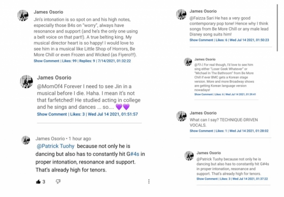 '제임스'는 뒤이어 "뮤지컬에서 그를 너무 보고 싶다", "G#4s의 음을 끊임없이 낸다", "테크닉이 기반된 보컬이다", "그는 이 부분에서 벨팅 보이스를 사용한 유일한 사람이야", "나의 뮤지컬 감독으로서의 심장이 매우 행복해해", "그 음은 테너들에게도 엄청 높아" 라며 지미 팰런쇼 유튜브 공식 채널에 끊임없이 댓글을 달며 진의 천부적인 보컬 능력에 대한 감탄을 감추지 않았다.