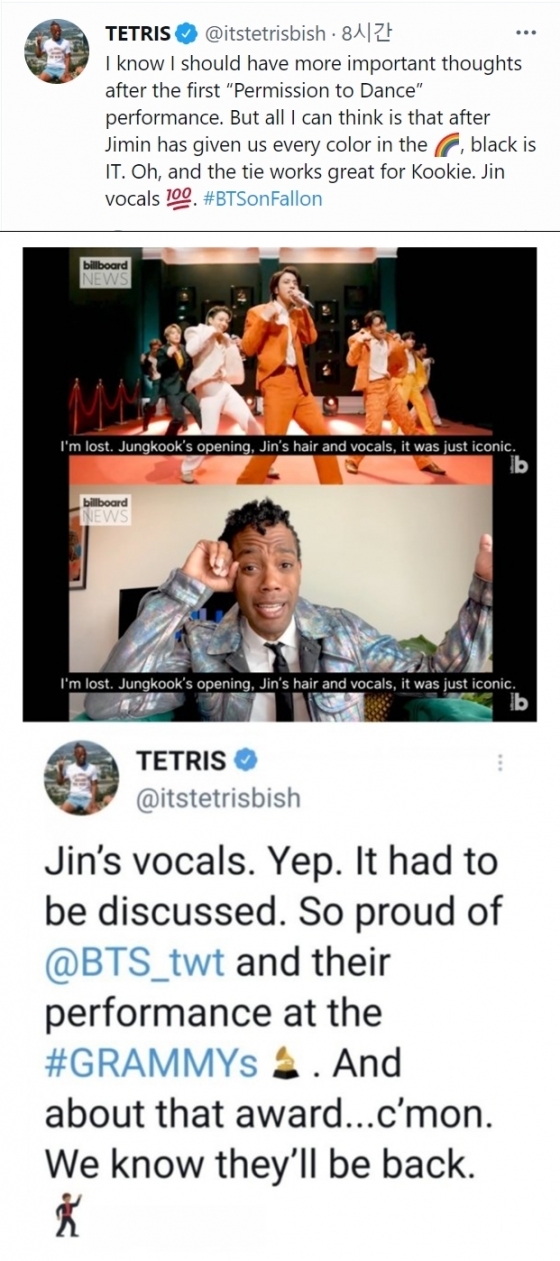 진의 뛰어난 가사 전달력과 아이코닉한 보컬능력에 사로잡힌 이가 또 있다. 빌보드 뉴스 진행자이자 빌보드 뮤직 어워드의 진행자이기도 한 '테트리스 켈리(Tetris Kelly)'또한 진의 보컬은 100점이라며 호평을 던졌다.