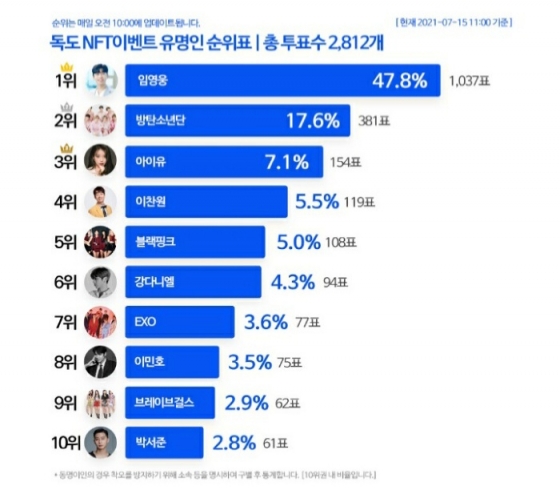 임영웅은 15일 오전 11시 기준 엔버월드(NvirWorld)에서 진행 중인 '독도 NFT 작품에 이름을 함께 올리고 싶은 유명인' 댓글 투표에서 47.8%의 득표율로 1위를 기록했다.