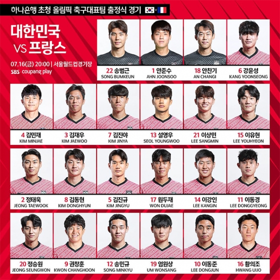 이밖에 정승원(24·대구FC)은 20번, 이상민(23·서울이랜드)은 21번, 김진야(23·FC서울)는 7번을 배정받았다. 이유현(24·전북현대)과 강윤성(24·제주유나이티드)은 각각 15번과 6번을 단다. 골키퍼는 송범근(24·전북현대)이 22번, 안찬기(23·수원삼성)와 안준수(23·부산아이파크)는 각각 18번과 1번을 달고 프랑스전 출전을 준비한다.