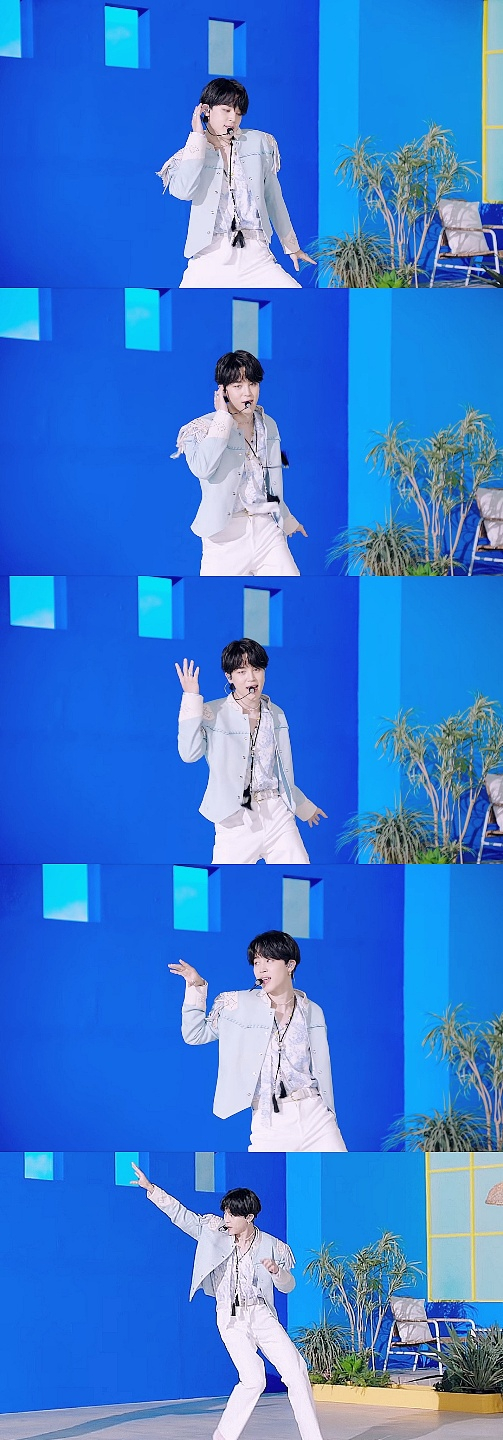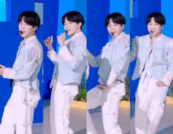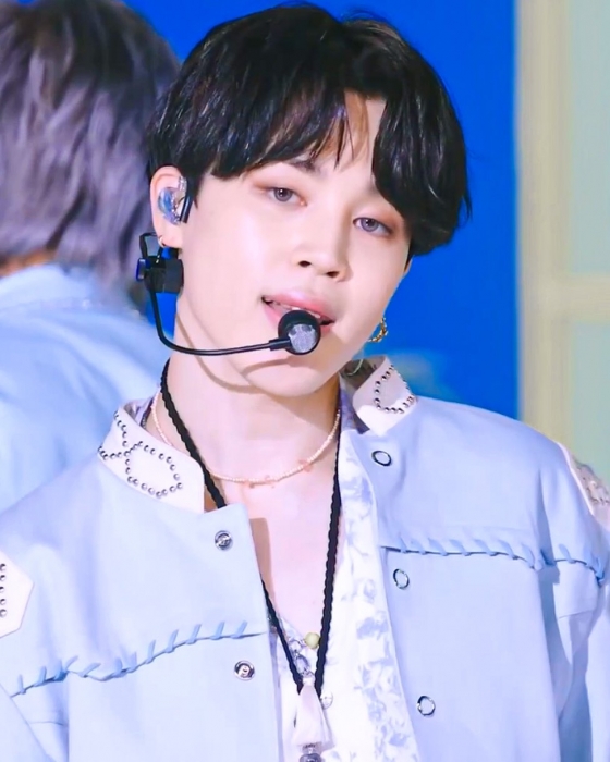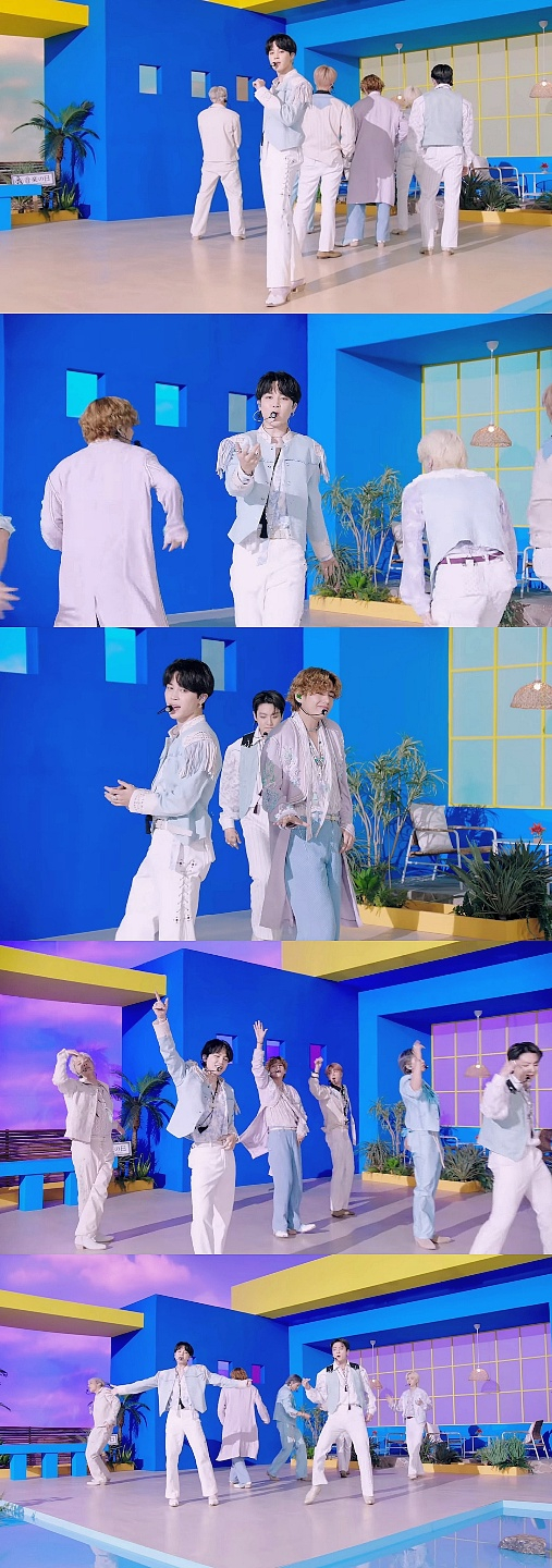 시원한 루프탑 수영장으로 연출된 무대에서 멤버 지민의 모델급 비율의 피지컬을 돋보이게 하는 유니크한 화이트 팬츠에 어깨 수술 장식의 재킷, 긴 칼라 셔츠를 착용해 청량하고 러블리한 모습으로 첫 시선을 사로잡았다.