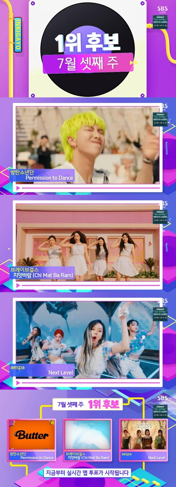 그룹 방탄소년단, 브레이브걸스, aespa(에스파)가 '인기가요' 1위 트로피를 두고 격돌한다.